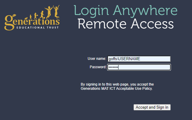 You will be prompted to re-enter your login credentials once more, however you will need to prefix your username with GOFFS\ which is the schools ‘domain name’